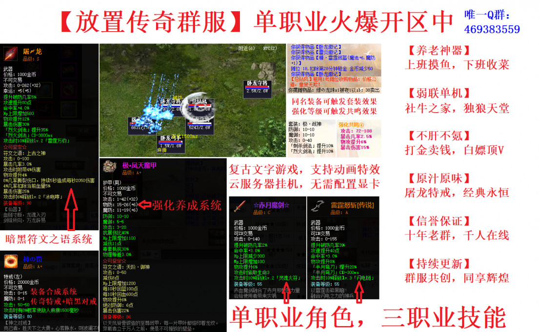 放置传奇,解放双手,重温经典,支持云挂机(无需显卡)。 游戏作者十年磨一剑,积累了丰厚的独立游戏制作经验。现推出单职业全新版本,在继承原有优秀玩法的基础上,推陈出新,加入更多特色玩法。 游戏内既有忠于原著的内容,如屠龙特戒、祖玛赤月等,也有开创性的玩法,如将两件完全不同的装备合成为一件全新的技能装备,使单职业游戏拥有了三职业技能。 游戏内90%以上的装备和材料均可交易,金币十分保值,可随时找氪金大佬兑换成元宝甚至变现,白嫖玩家完全可以用双手创造财富最终升到顶V。 除此之外,游戏内还有符文之语、套装、强化、世界Boss、竞技场、收藏图鉴、节日活动等特色玩法,两千人大群期待你的加入。Q群:469383559。 新手建号填写邀请码,领双倍礼包。邀请码:南门秋